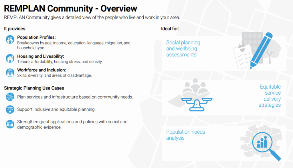 REMPLAN Community transforms complex demographic and social data into clear, actionable insights. Drawing on over 75 social and demographic indicators, it provides a complete, location-specific view of who lives, works, studies, and thrives in your region, and how that’s changing over time.