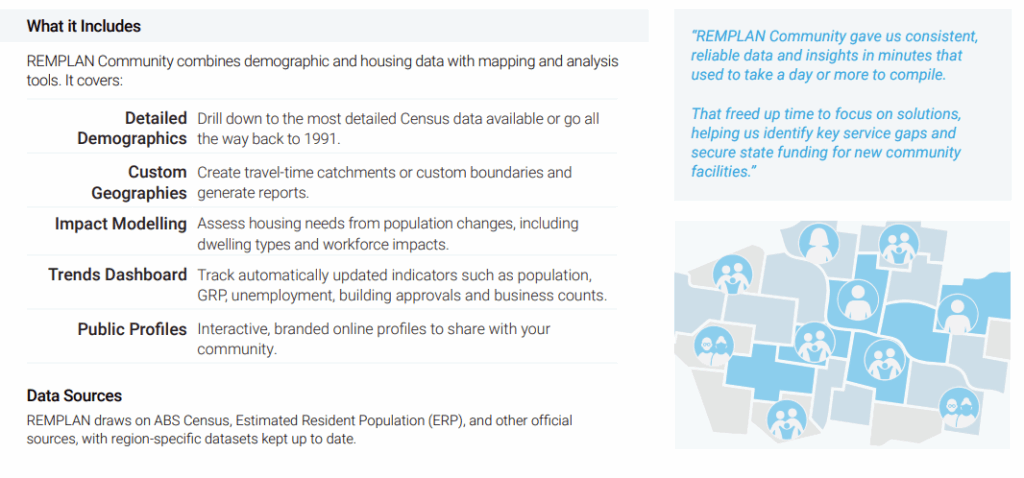 Whether you’re developing a housing strategy, reviewing a planning scheme, or applying for state and federal grants, REMPLAN Community provides the trusted evidence you need to support your work.