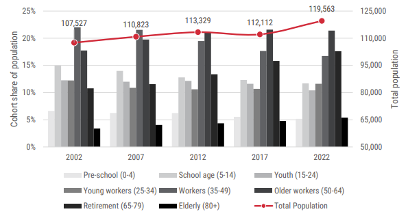 The Cradle Coast Authority encompasses 9 local government areas – Burnie, Central Coast, Circular Head, Devonport, Kentish, King Island, Latrobe, Waratah-Wynyard, and West Coast. The Cradle Coast region has sustained annualised population growth of 1.3% over the last five years (to 2022) and had a combine estimated resident population of 119,673 in 2022.